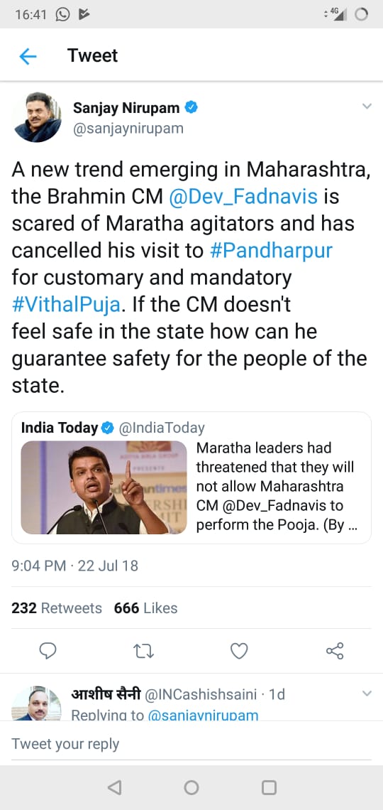 However, members of the opposition are trying their best to fan caste base unrest in the state and have repeatedly referred to Fadnavis’ caste derogatorily in a bid to fan tensions. Here Sanjay Nirupam of the Congress can be seen referring to CM Fadnavis’ caste to further tensions already brewing in Maharashtra.