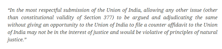 Additional Solicitor General Tushar Mehta, representing the Union of India has stated submitted in the affidavit, “I state and submit that so far as the constitutional validity Section 377 to the extent it applies to ‘‘constitutional acts of adults in private’’ is concerned, the Union of India would leave the said question to the wisdom of the this Hon’ble Court.”