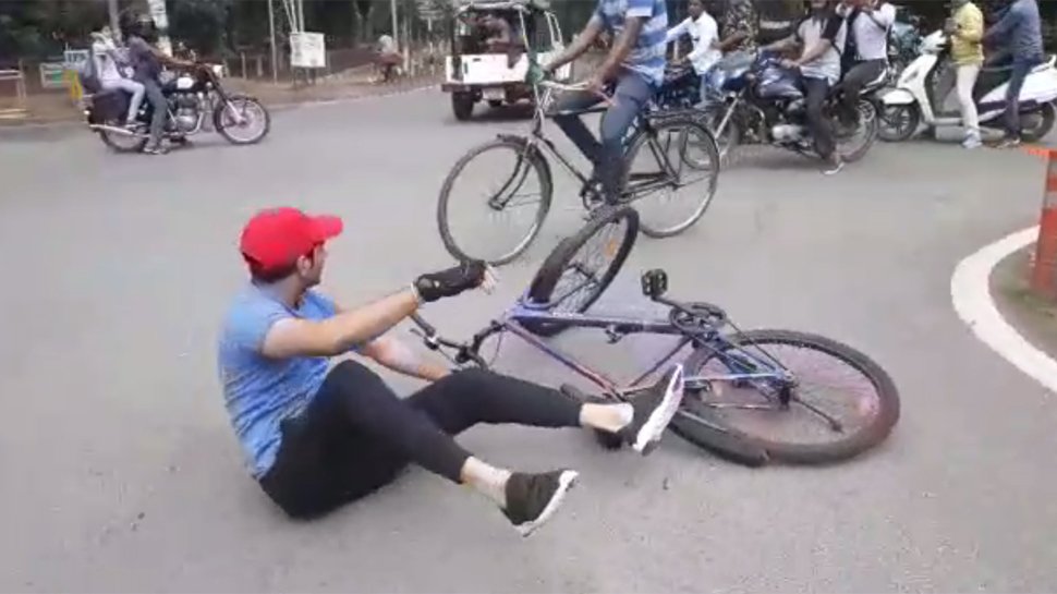 #WATCH RJD leader Tej Pratap Yadav tumbles to the ground during a cycle rally in Patna earlier today pic.twitter.com/ulgdH4GZYx
