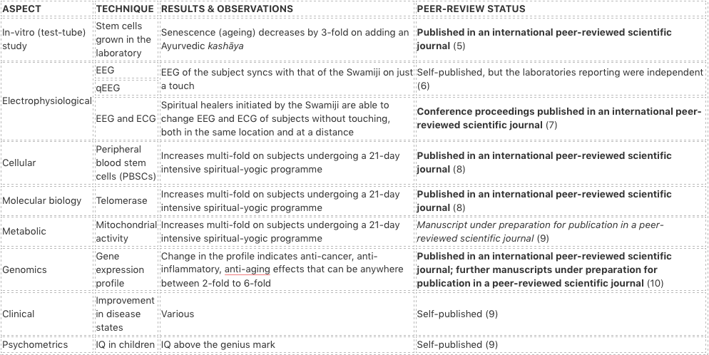 Forgetting the realm beyond science, for now, just the measurable and scientifically attestable benefits seem to point to a Hinduism that is possibly beyond ordinary science. No known technique or drug in modern medicine can produce even a part of the effects (ageing to metabolism) observed and reported in peer-reviewed scientific publications by these researchers.