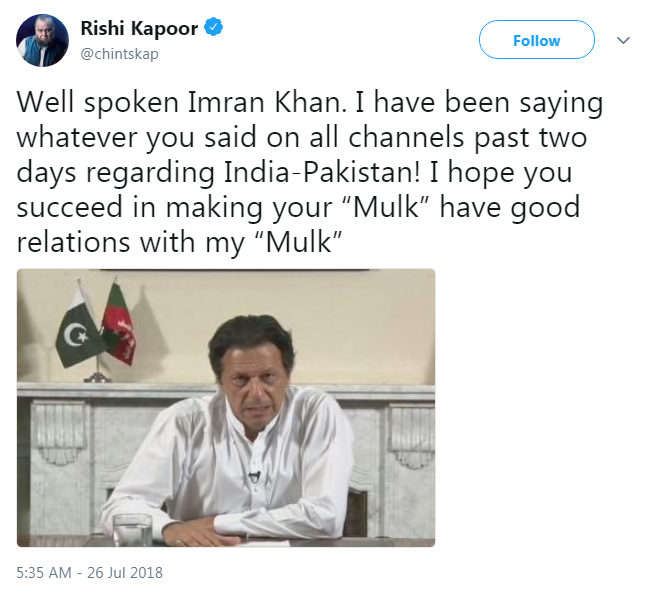 Even veteran actor Rishi Kapoor, who plays the lead role in the movie, had been very affectionate in his approach towards Pakistan’s new probable PM-elect Imran Khan. In a tweet that was mocked widely as brazen and opportunistic movie promotion, he had asked Imran Khan to help better bilateral ties with India.
