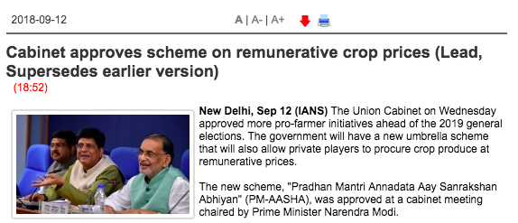 Saxena further stated that after some time a news advisory was issued by the agency which read, “IANS is withdrawing a story “Cabinet approves scheme on remunerative crop prices” which moved at 1756 hours. It contains inaccuracies. Please guard against its publication. A substitute version has moved at 1844 hours.”