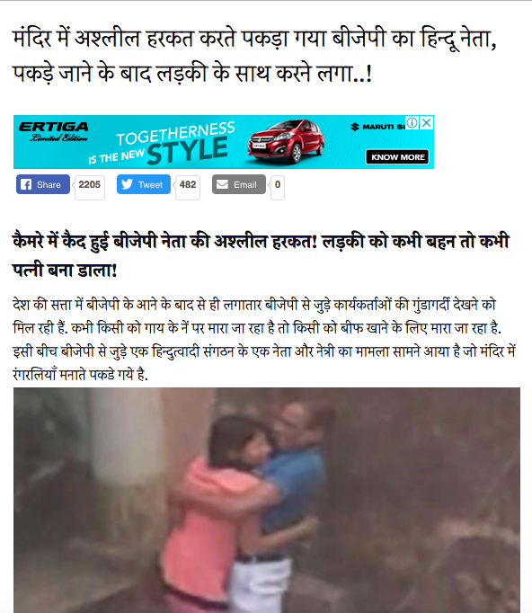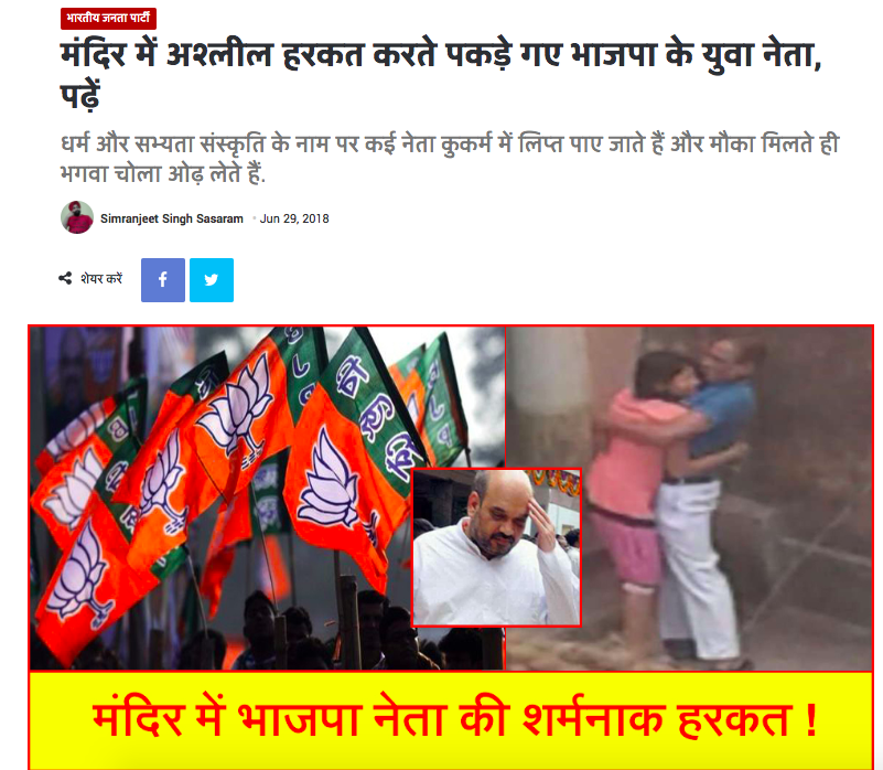A June 2018 post on viralinIndia.net mentions how a BJP leader in Badmer was caught in a compromising position inside a temple.
