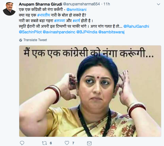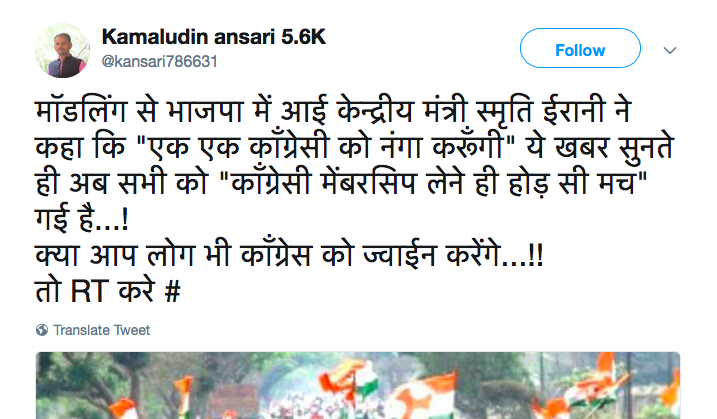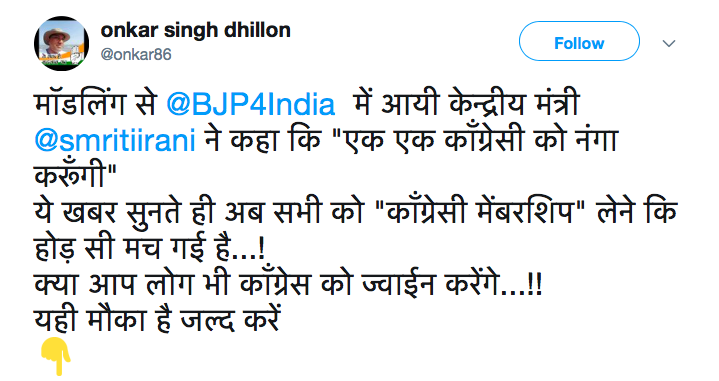 @narendramodi की लाड़ली @smritiirani ने कहा एक एक कांग्रेसी को नंगा करूंगी। सारे भाजपाई कांग्रेस जवाइन होने के लिए ललाइत हो गये। कहने लगे हमें भी नंगा करो स्मृतिजी हम भी कांग्रेसी हो गये 🙂 pic.twitter.com/RfsKpECqYh
