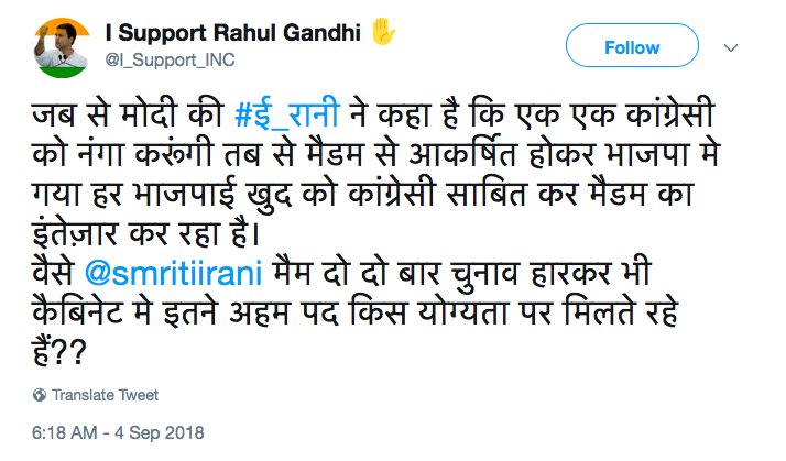 Sadly, it is not mere IT cell members, workers or supporters that attack Smriti Irani with the filthiest of sexually targeted remarks. in the past, even elected Congress MLAs and close relatives of the Gandhi family have been involved in such attacks against Irani.
