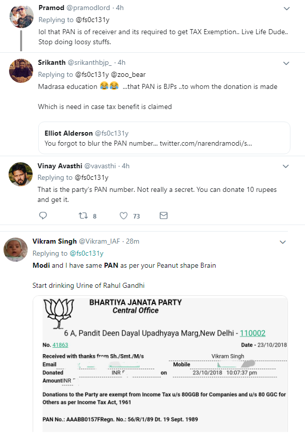 People also informed him that in PAN of individual persons, the fourth character is always ‘P’, while the PAN on the receipt is ‘B’, which stands for Body of Individuals, and the fifth character is the first character of surname of the person, or first character of name of the non-person entity. And the fifth character in this case is B, if it was Modi’s PAN, it should be M.