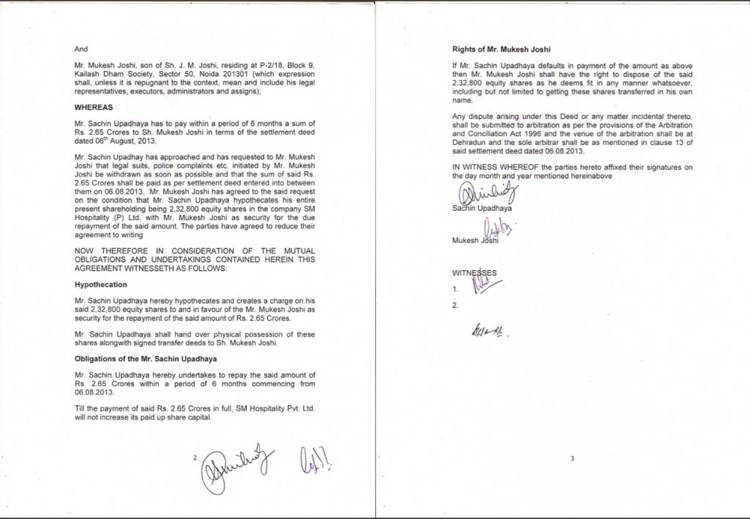 As per the understanding and the statement given by Mr Joshi in the matter filed before the Company Law Board, he gave a Loan of R.s 1.7 Crores to the company (SM Hospitality) for the purchase of land. Sachin Upadhyay, however, did not contribute his share of investment and kept delaying it on one pretext or another.