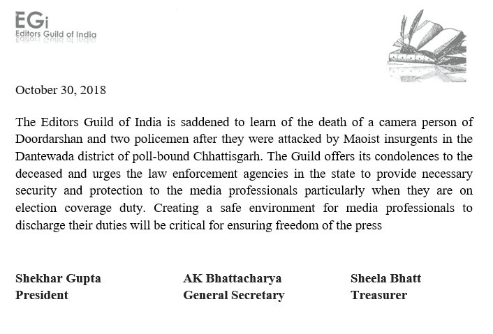 “Editors Guild of India has issued a statement on the Dantewada Naxal attack that killed a Doordarshan camera person. You may also read the full statement here”.