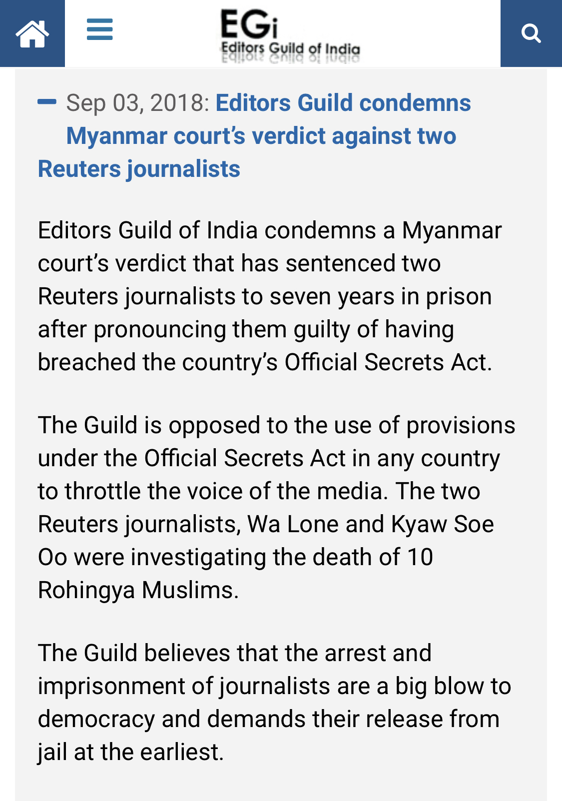 Let us compare today’s statement to what the Editors Guild said when two journalists were sentenced to seven years in prison… in Myanmar. We know the two journalists were named Wa Lone and Kyaw Soeoo because Editors Guild named them in their statement. Their statement is as follows: