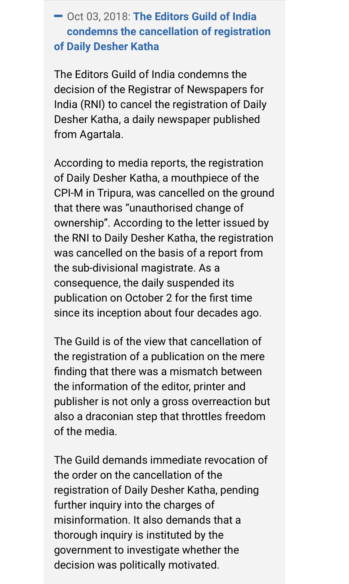 The Editors Guild released a long-winded statement when a communist mouthpiece was penalised for not adhering to the law of the land. The Registrar of Newspapers cancelled the registration of Desher Katha, which is a mouthpiece of the Communist Party of India – Marxist for ‘unauthorised changed in ownership’. Their statement, in this case, is substantially longer than the one released today.. where they were talking about Achyuta Nanda Sahu being murdered by armed Naxals. Their full statement was: