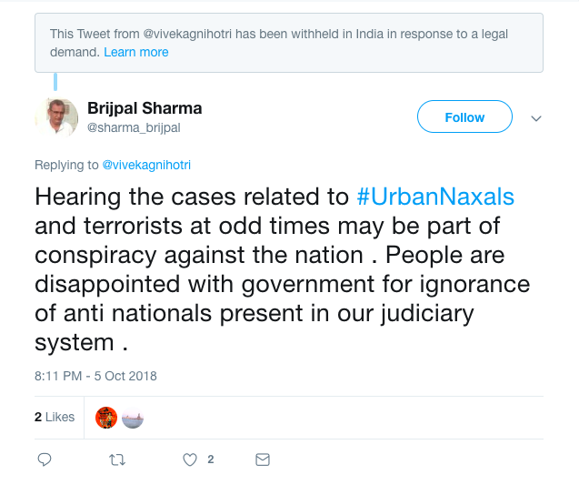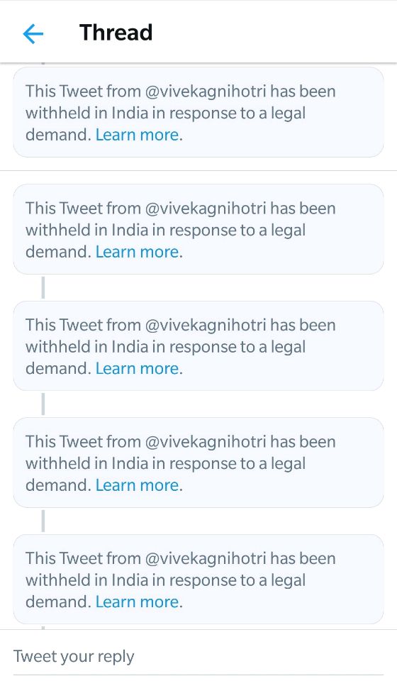 It appears that as of now, 12 tweets by Vivek have been withheld on Twitter in “response to a legal demand”. Following is a screenshot of the thread where responses from 5th October 2018 can be seen, but the parent tweet of Agnihotri, to which people responded to, has been withheld.