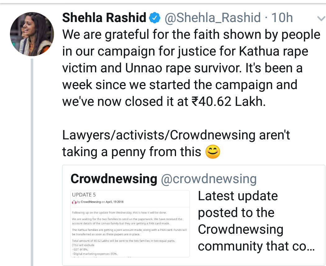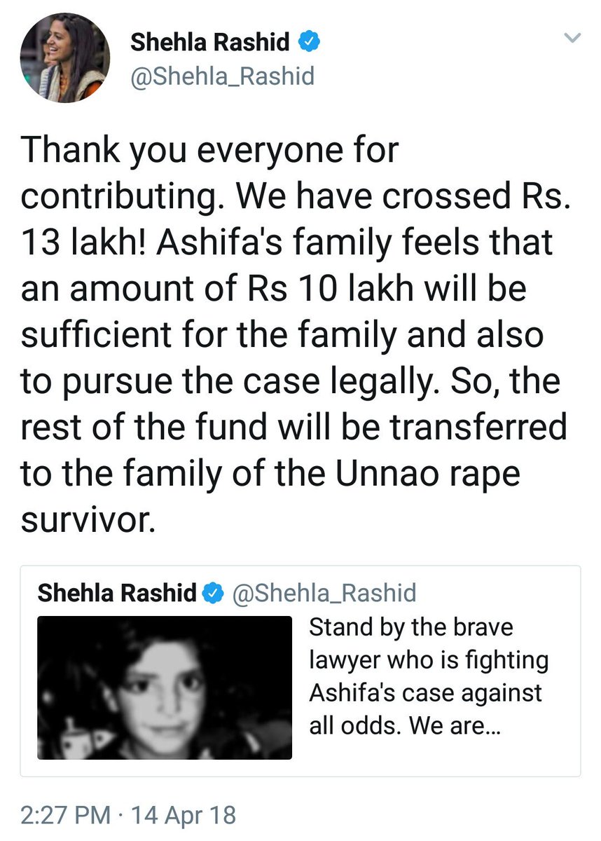 Leftist JNU activist Shehla Rashid had claimed that funds of over 40 lakhs had been collected from donors. She had later also stated that the lawyers are not charging money and hence a sum of rupees 10 lakhs will be handed over to the rape victim’s family.