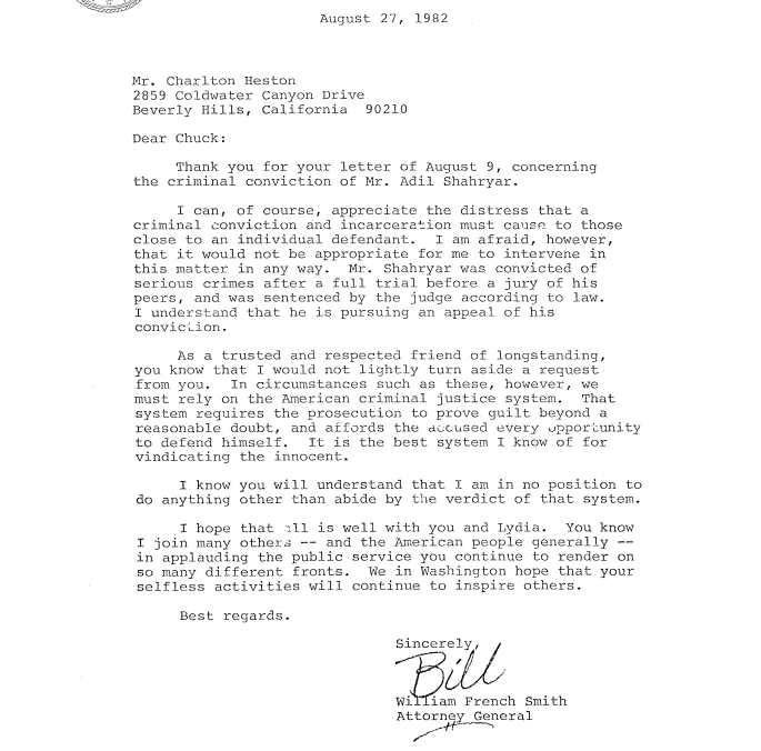 Hollywood actor Charlton Heston had requested the then Attorney General William French Smith in 1982 to intervene in the matter. The Attorney General, however, after his assistant’s memorandum, flatly refused to consider the gravity of the charges against Shahryar.