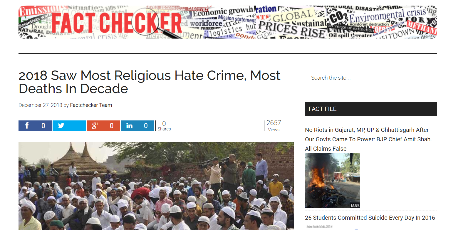 To give readers an idea about the manner in which factchecker.in manipulates data, when Vidharam Katheria, a Dalit, was murdered by a group of Muslims over a family dispute, IndiaSpend did not consider a hate crime claiming that there was no evidence to suggest that the crime was motivated by religious hatred. But when one Azhar Khan was murdered for fishing near a Temple, it was treated as a religious hate crime although there was nothing to suggest that the crime was motivated by religion. This is merely a single instance. There have been several occasions where factchecker.in has indulged in such malpractice.