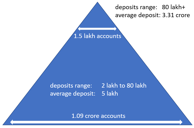 - Just 1.5% of these accounts (about 1.5 lakh accounts) hold more than two-thirds (Rs. 10 lakh crore) value of deposits with an average deposit of Rs. 3.31 crore in each account