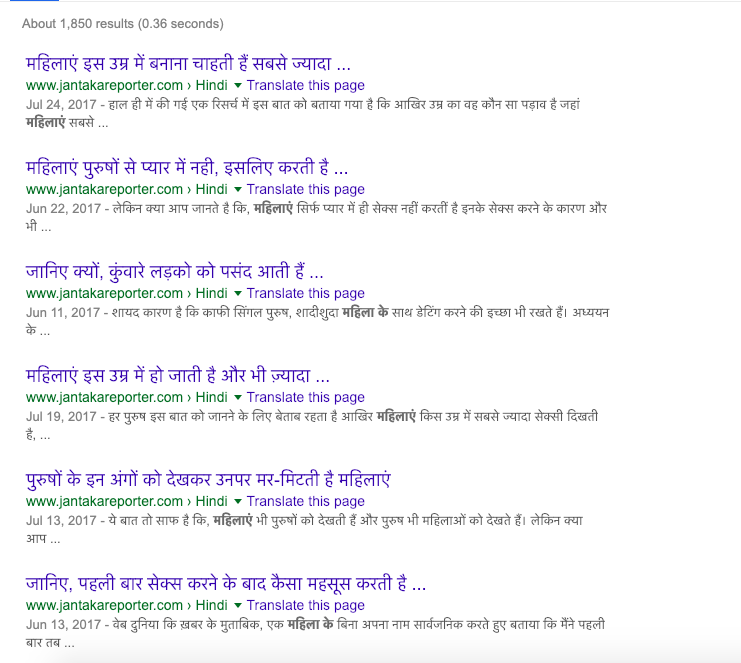 When we typed in the keyword ‘mahilayen’ (women) to find that article, to our embarrassment we found a trove of sleazy articles on Janta Ka Reporter.