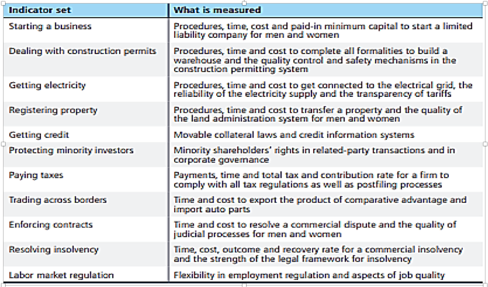 Ease of Doing Business captures several important dimensions of the regulatory environment affecting domestic firms. It provides quantitative indicators on regulation for starting a business, dealing with construction permits, getting electricity, registering property, getting credit, protecting minority investors, paying taxes, trading across borders, enforcing contracts and resolving insolvency highlighted in the table below. Ease of Doing Business also measures features of labour market regulation which are reported as a separate section and not included in the ranking.