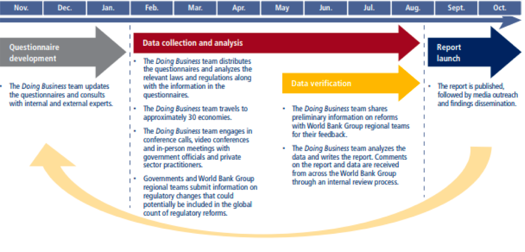 The above diagram depicts the timeline of EODB report launch, beginning with Questionnaire development followed by Data Collection & Analysis and, Data verification, until the final step of publishing the report.