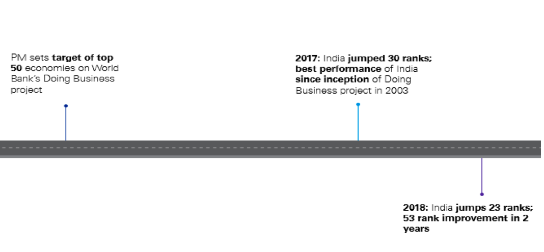 The diagram below depicts the timeline of India’s performance in EODB. Against initial target set of reaching top 50 in the World in EODB rankings, India jumped 30 ranks in 2017, followed by 23 ranks in 2018.