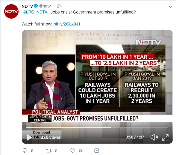 Tonight at 9: the Railways Minister now claims that 2.5 lakh people will be employed by his ministry alone in the next 2 years. Last year he had said the railways could create 10 lakh jobs in one year. What’s happening with India’s jobs? pic.twitter.com/24GYQauaeI