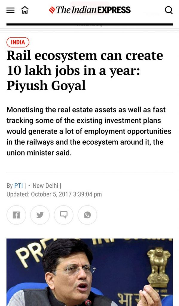 Last year, Railways Minister @PiyushGoyal had said that the Indian Railways ecosystem can create a million jobs. IR has already done its bit on hiring – almost 3.5L jobs on offer.