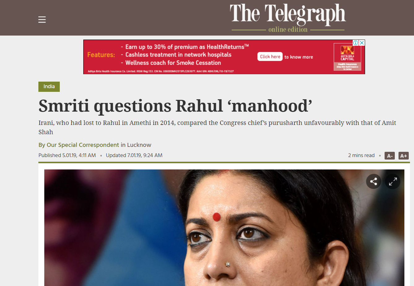 In reality, however, Irani said no such thing at all. She said that BJP President Amit Shah had reached his position through his own ‘Purushartha’ while Rahul Gandhi became the President of his party due to his mother’s blessings. The Telegraph translated ‘Purushartha’ as ‘manhood’.