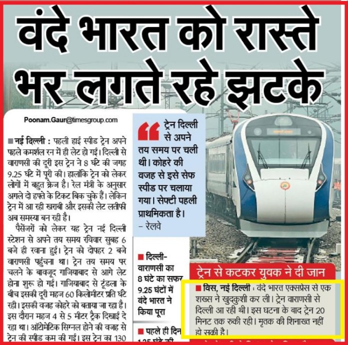 But this clarification still does not explain what was the need to publish a one-month-old news today. And even the Delhi edition, which carried the correct news, used a misleading headline to suggest it is a setback for the Vande Bharat Express project. Committing suicide by jumping in front of trains is an unfortunate event that happens quite often, but to term that as a setback for a newly launched train is a completely wrong presentation of the incident. People deliberately giving their lives by coming under running trains can’t raise questions on performance on a train, and Navbharat Times report on both the editions seems to be designed to spread negative information about the newly launched train.