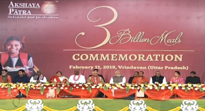 Prime Minister Narendra Modi visited Vrindavan today to attend the occasion of the Akshaya Patra Foundation serving its 3 billionth meal. He unveiled a plaque to mark the occasion at Vrindavan Chandrodaya Mandir and served the organisation’s 3 billionth meal to underprivileged children.