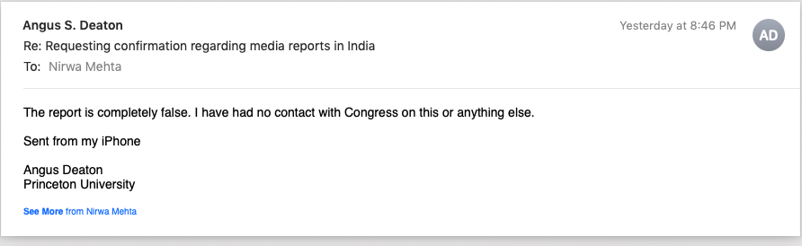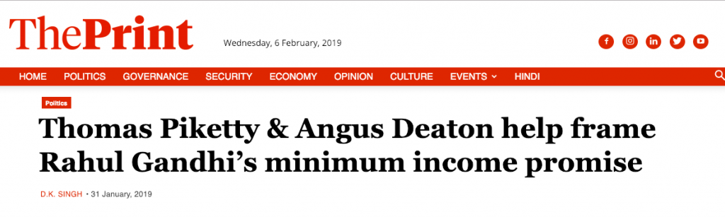 On 31st January, ThePrint ran a report by one D. K. Singh who claimed that Angus Deaton, a British economist who won the Nobel Prize in Economics in 2015 along with French economist Thomas Piketty are advising the Congress on its minimum income guarantee program.
