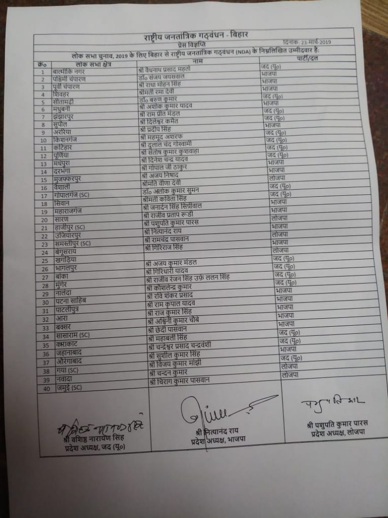 Announcing the candidates’ list, BJP in-charge for Bihar Bhupendra Yadav said Lok Janshakti Party’s Chandan Kumar will contest from Nawada. Lok Janshakti Party’s Chirag Paswan will contest from Jamui. BJP’s Ramkirpal Yadav will contest from Patliputra, RK Singh from Arrah, Aswani Choubey from Buxar, Radha Mohan Singh from East Champaran, Rajiv Pratap Rudy from Saran.