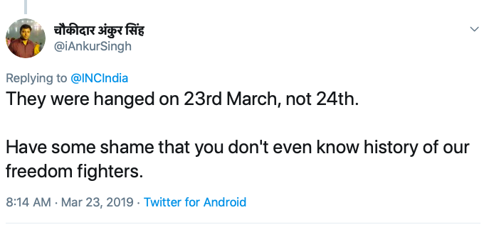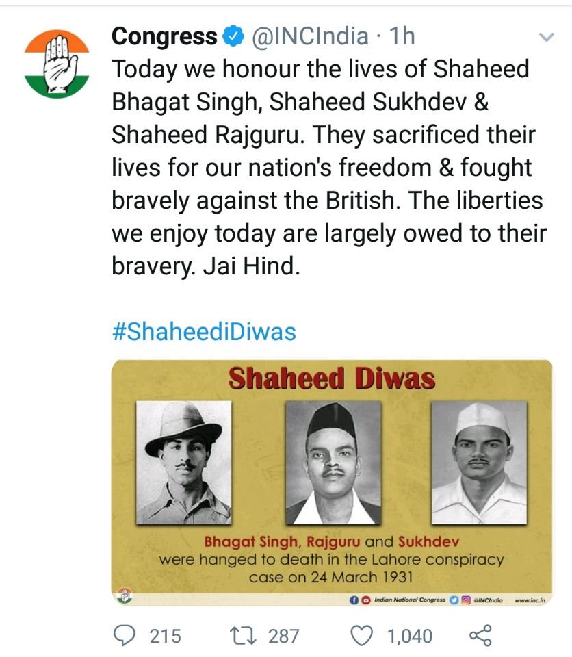 The official Twitter handle of Congress, however, has made another gaffe in their Tweet commemorating Shahidi Diwas. They have marked 24 March 1931 as the date of the hanging of Bhagat Singh, Sukhdev, and Rajguru. Ironically, they have tweeted it today, on 23 March, without bothering to rectify the date.