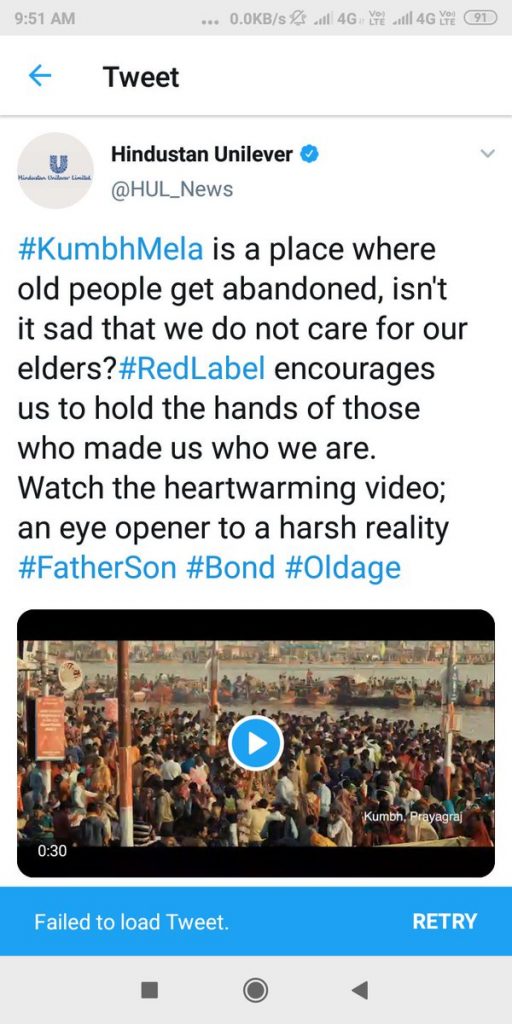Following the outrage on the Hinduphobic text and video, HUL, in a damage control mode, deleted the original tweet, about 20 hours after it was shared, and posted a new tweet with same video. In a new tweet, the video is shared with an alternate text removing the reference that Kumbh Mela is a place where old parents get abandoned. However, towards the end, the preachy text still remains.