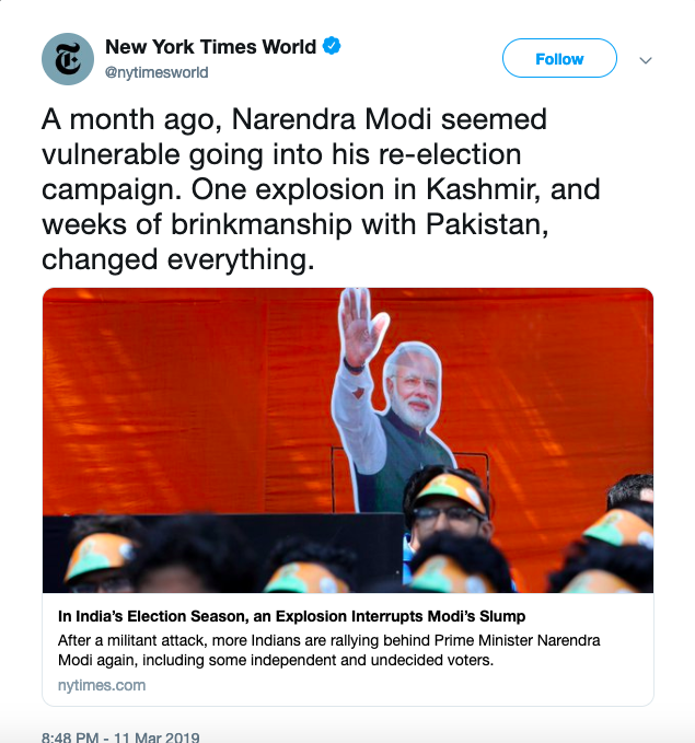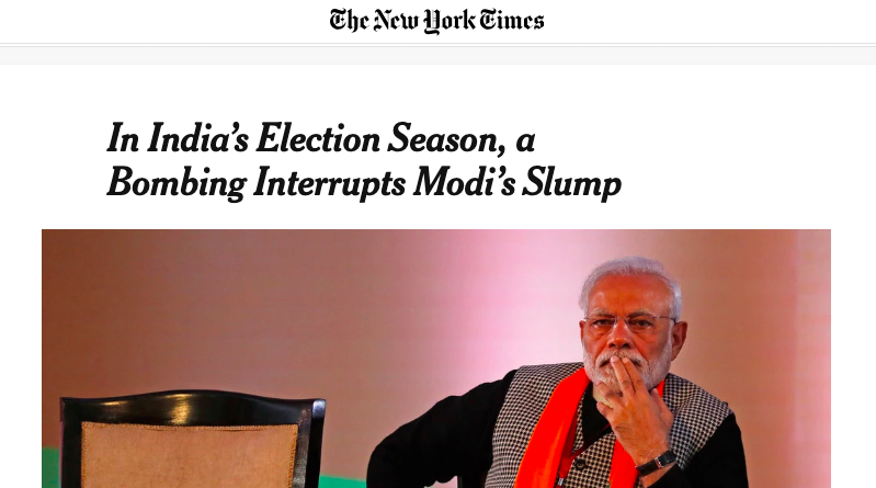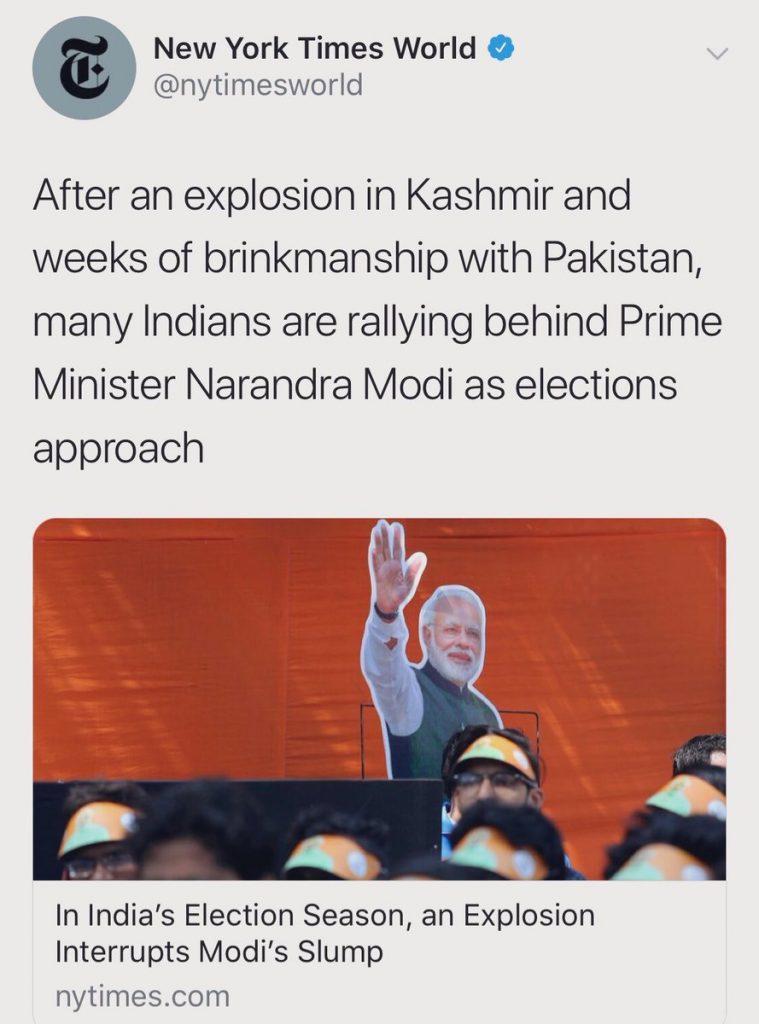 In an article published yesterday, NY Times mentions that as the 2019 general elections were closing in, Modi’s popularity was on a low and the “rejuvenated opposition was landing punch after punch with corruption allegations. But one bombing in Kashmir, and weeks of military brinkmanship with Pakistan afterward, appears to have interrupted Mr. Modi’s slump.” Not surprisingly, one of the co-authors of this bigoted piece is Maria Abi-Habib, who wrote the March 3 article peddling pro-Pakistan narrative.