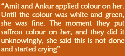 Jyoti shared another incident involving Holi. “Amit and Ankur applied colour on her. Until the colour was white and green, she was fine. The moment they put saffron colour on her, and they did it unknowingly, she said this is not done and started crying,” Jyoti said while sharing some of the photographs of Umam crying with saffron colour splashed on her face. The report says that several other students also confirmed this to Swarajya.