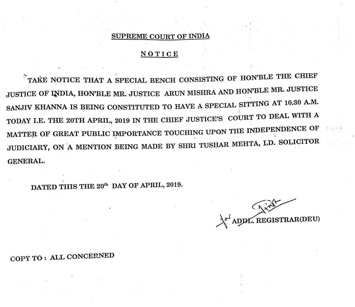 He said he has to tell the citizens of India that the judiciary is under serious threat and with such plots, good people will never come to the Judiciary, however, he will still carry on with his job. He added that this issue (of sexual harassment charges) won’t be considered by him but senior most judges and his brothers.