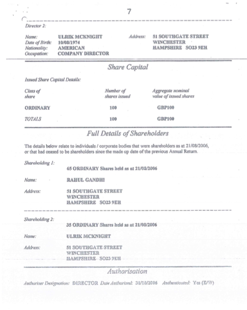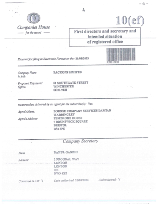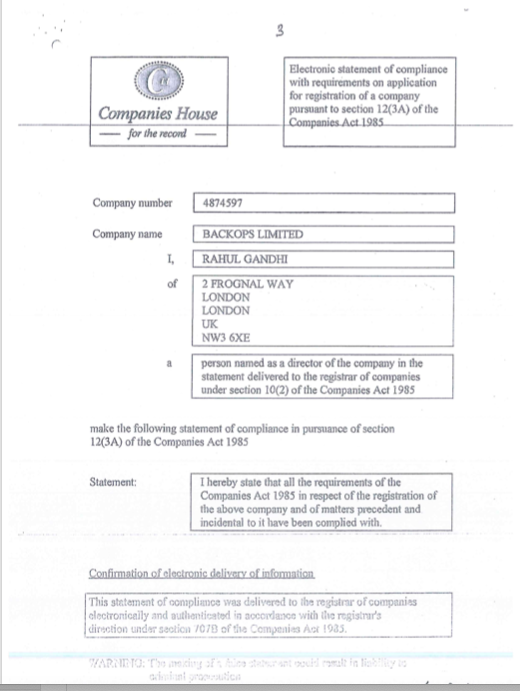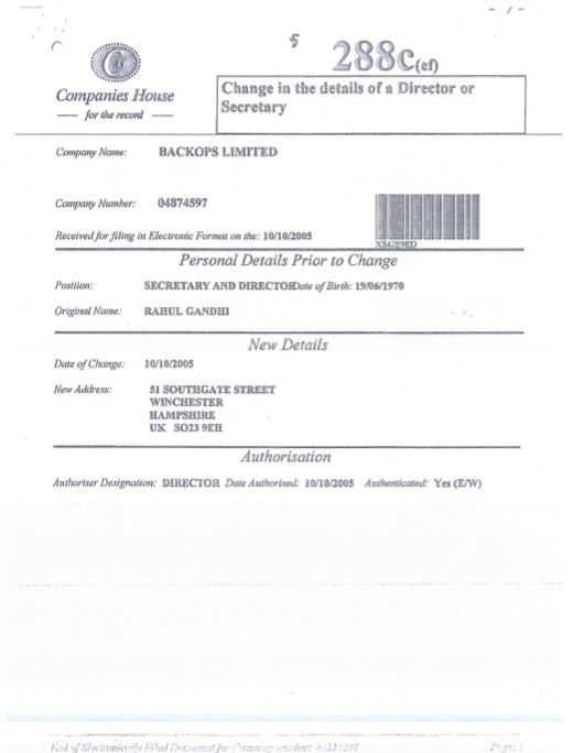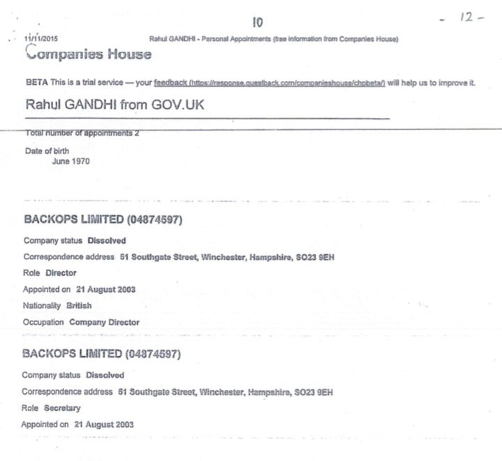 Congress President Rahul Gandhi gives his England address as the director of BACKOPS Limited.