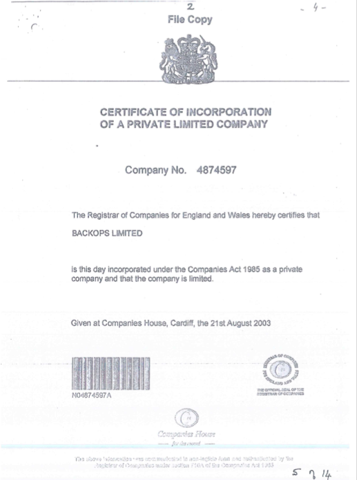 The Certificate of Incorporation of BACKOPS Limited from the Registrar of England and Wales. The certificate is registered as on 21st August 2003. These are the details of the company no. 4874597.