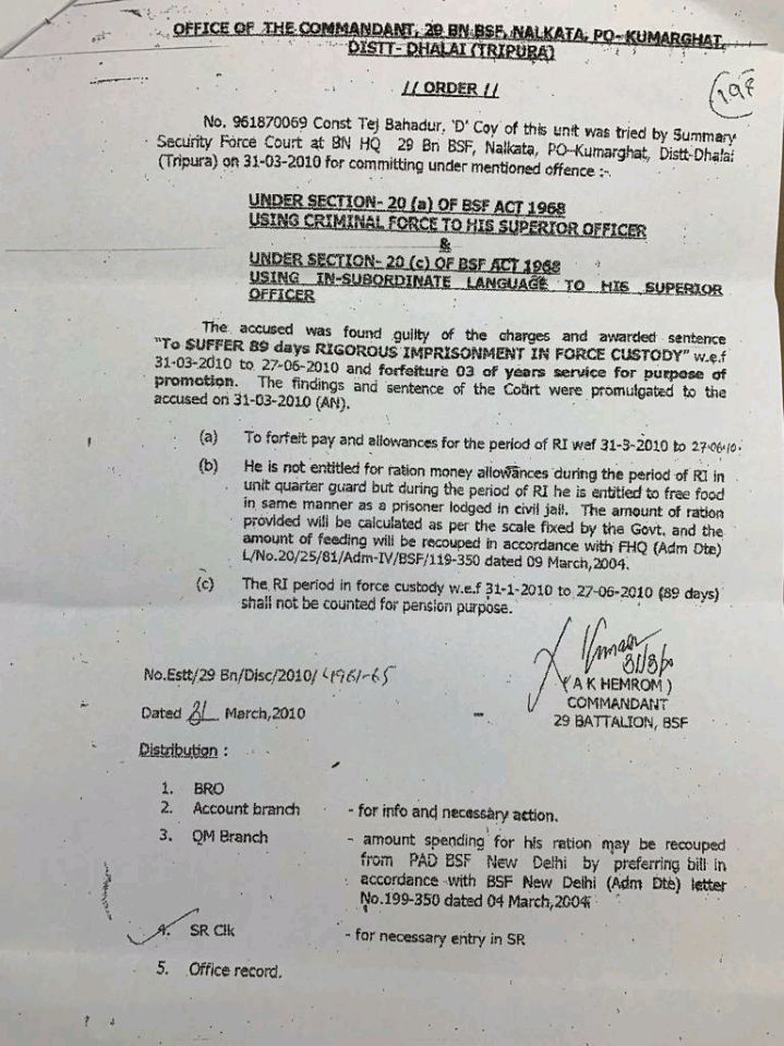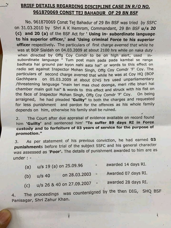 In March 2010, a BSF inquiry had found that Tej Bahadur Yadav had used criminal force and inappropriate language for his superiors. Yadav had pleaded guilty on both the charges and requested for less punishment and pardon. The Court had found him guilty, and he was sentenced to 3 months of rigorous punishment in custody of the force. His promotions were stalled for 3 years, and he didn’t get any salary, allowances during his jail term.