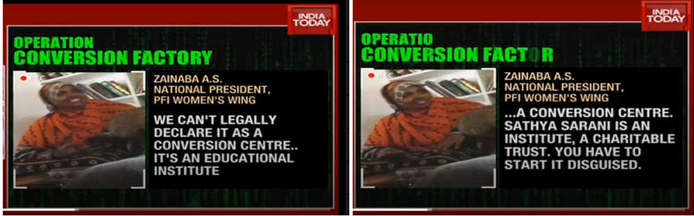 However, when she thought that camera was off, she admitted to proselytizing about 5,000 non-Muslim women into Islam. She also explained how conversion centres have to be disguised as charitable or educational establishments in order to prevent any backlash from RSS and explained their modus operandi in detail.