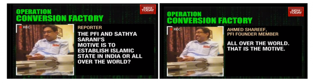 Ahmed Shareef, the founding member of PFI talked about patriotic stuff including India’s freedom struggle in front of the camera. When he thought that the camera was off, he talked about how their goal was first to convert India into the Islamic State and then the entire world. He also talked about receiving funds from the Middle East for their mission.
