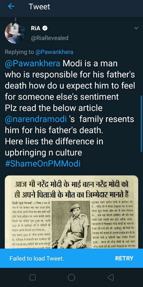 A person named Ria, who claims to be a member of Congress in South Mumbai, has shared a fake newspaper clipping which portrays PM Modi’s late father as a thief and claims that he had died of a heart attack after a young Narendra Modi left home taking all the gold his father had bought from the stolen money. The fake clip also claims that PM Modi’s siblings still blame him for their father’s death.
