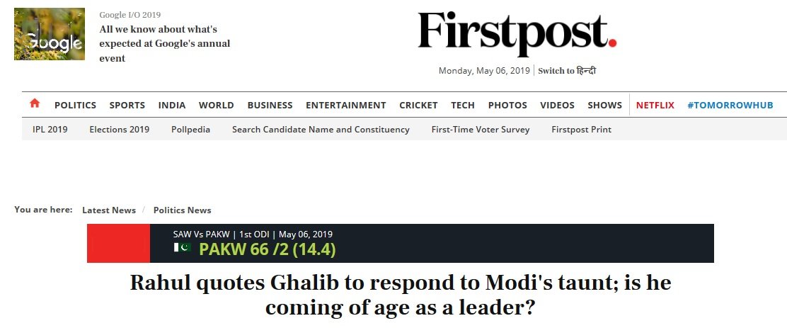 The follow-up act was done by FirstPost (and think later). Apparently, a quote from Mirza Ghalib – and not any policy position – was sufficient to impress the writer about Rahul’s growth.