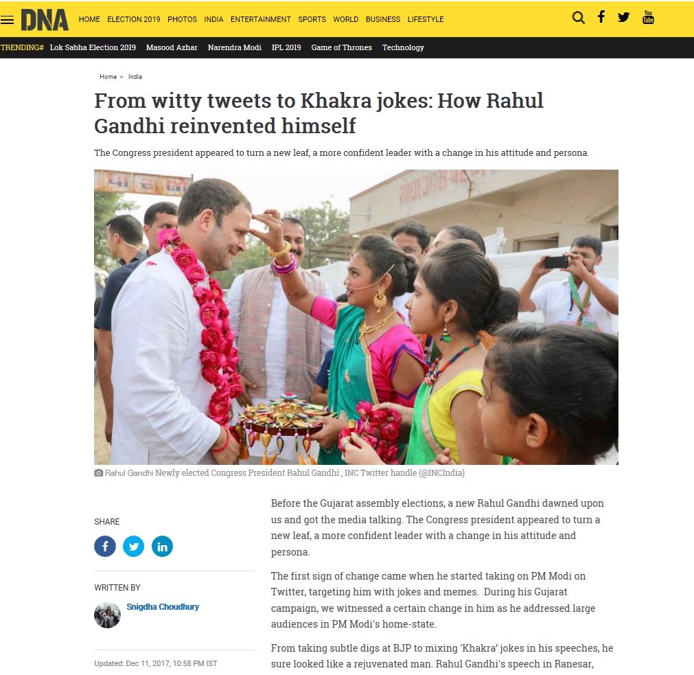 When Mirza Ghalib is good enough, why not tweets and jokes. Because none of these are his creations or ideas. The benchmark for Rahul is so low, that if he delivers the given lines with some clarity, his entourage is ready to back him up with stories. Like here, DNA seemed to be mighty impressed with his khakhra jokes and tweets.