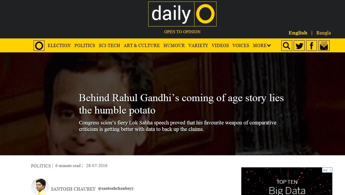 First off the mark was DailyO, where the author was blown over by Rahul’s mentioning potato price in a parliament speech. I strongly recommend the readers to read this piece, where the focus is on where and how many times Rahul has talked about potatoes. If only he had known that “yahan se aaloo daloonga, wahan se sona nikaloonga” was coming, the author would have saved some ink.