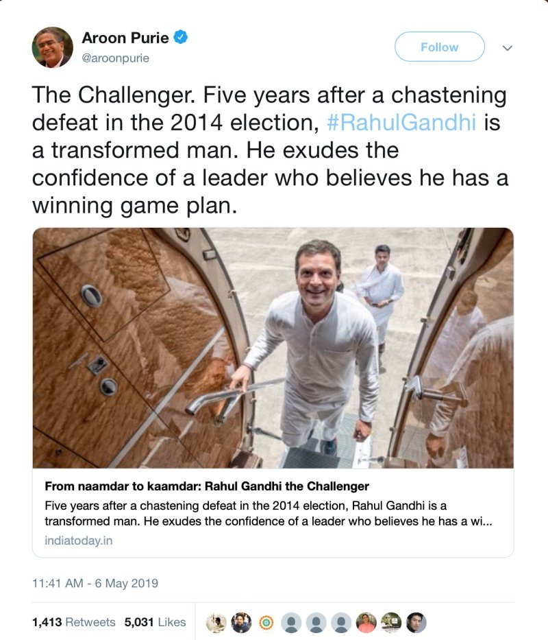 And, of course, the most recent by the Chief of India Today Aroon Purie where he shared an article hailing Rahul Gandhi by Raj Chengappa.