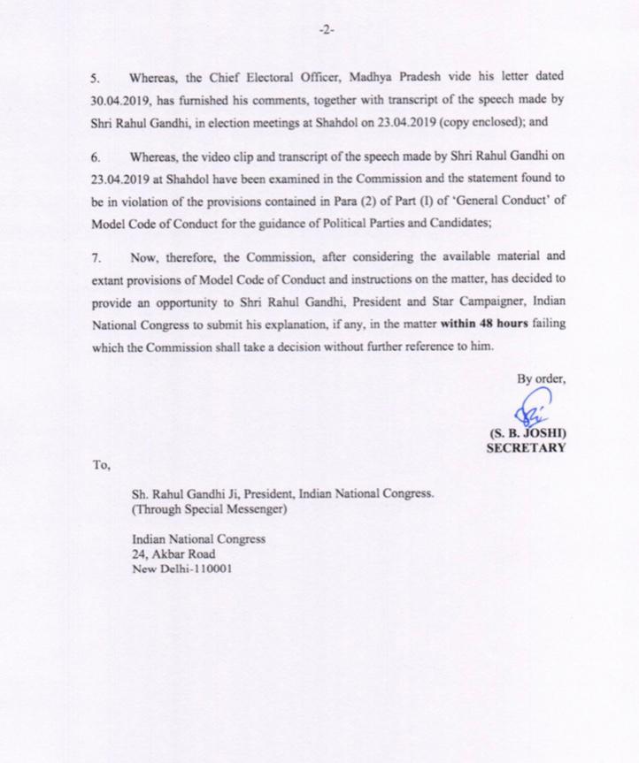 The EC, after examining the video clip and the transcript, found the statement to be in violation of the Model Code of Conduct. The EC has given Rahul Gandhi 48 hours to provide an explanation in this regard, failing which, the EC will take a decision without further reference to him.