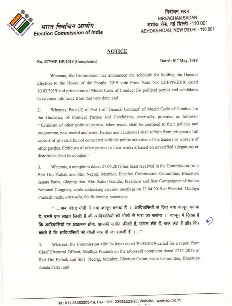 The EC had received a complaint from Om Pathak, BJP, regarding the objectionable comment made by Rahul Gandhi. Rahul Gandhi had said, “Ab Narendra Modi ne naya kanoon banaya hai. Adivasiyon ke liye naya kanoon banaya hai, usmein ek line likhi hai ki adivasiyon ko goli se maara jaa sakta hai. Kanoon mein likha hai ki adivasiyon par akraman hoga, aapki zameen chhinte hai, jungle lete hai, jal lete hai aur phir kehte hai ki adivasiyon ko goli maar di jaa sakti hai”. (Now Narendra Modi has brought in a new law. New law for Adivasis has a line which states that Adivasis could be shot at. In the law, it is written, Adivasis could be attacked, they snatch away your land, your jungle, water and then say that adivasis could also be shot at.)