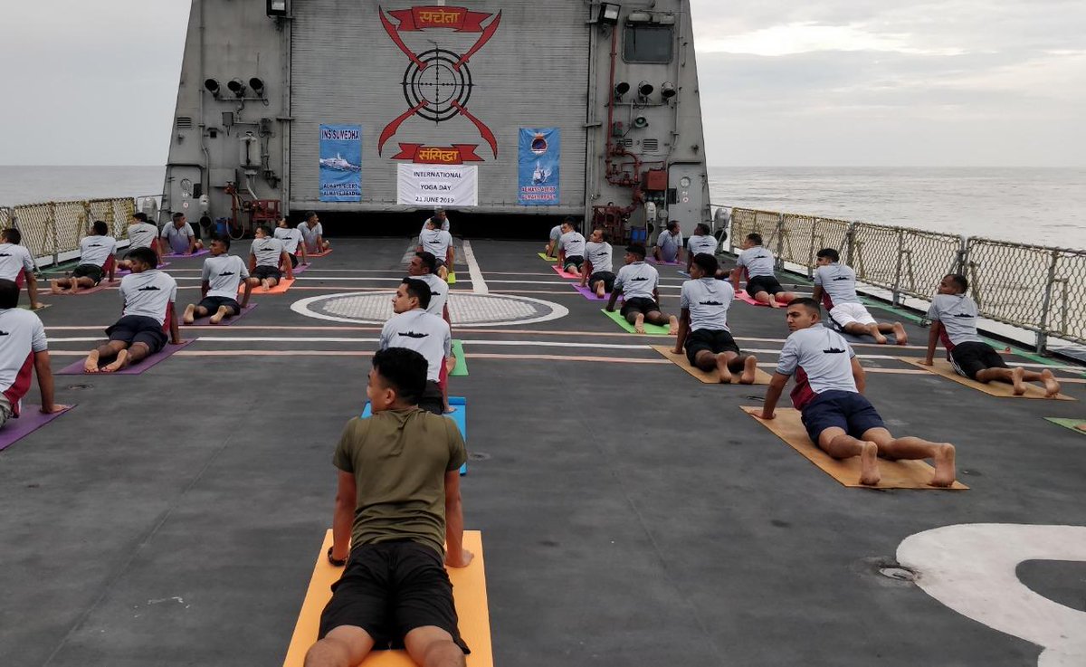 Indian Navy personnel also performed various yoga asanas onboard INS Sumedha: