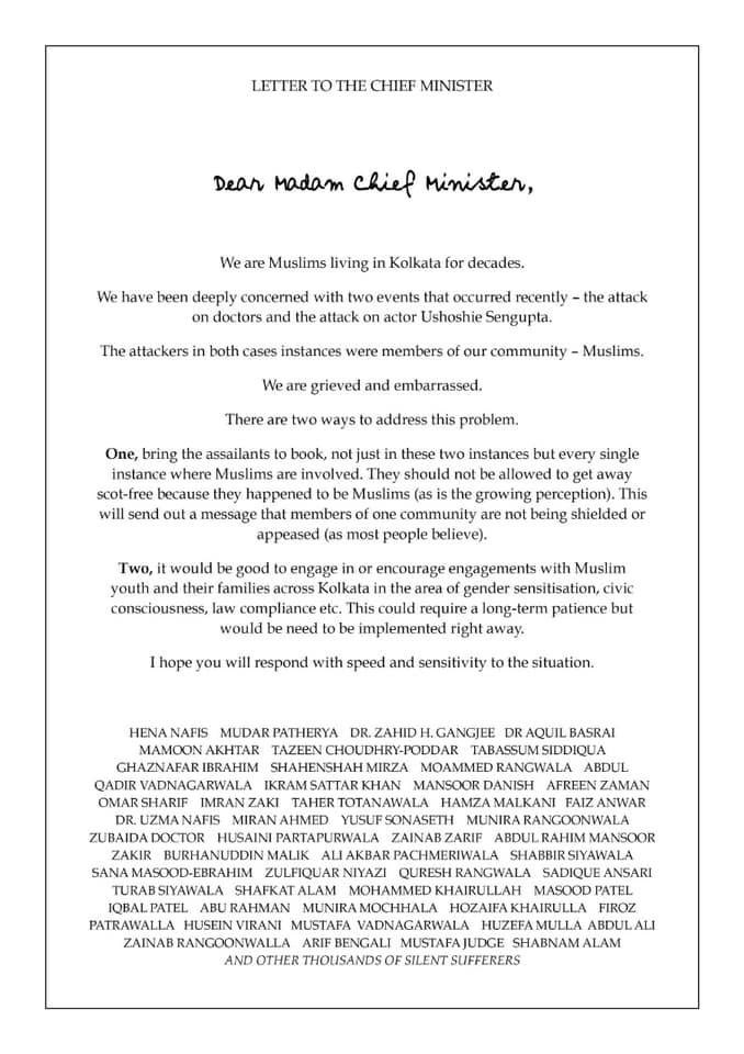 In the letter, the notable Muslims have written that they are Muslims who are living in Kolkata for decades and have been deeply concerned by two events that have recently occurred – the attack on doctors and the attack on former Miss India Ushoshie Sengupta.