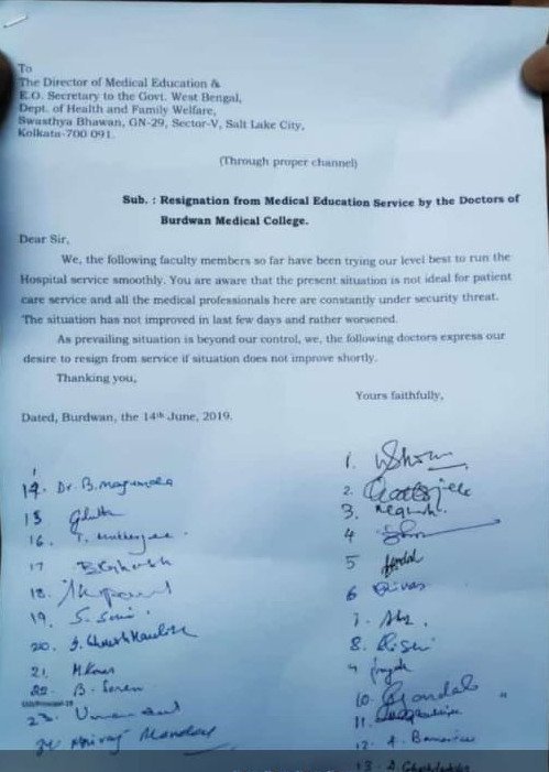 Today, the Doctors of the Kolkata Medical College also came out in support of fellow doctors and handed over their resignations. The latest to join the league are 37 doctors of the Rampurhat Medical College, Birbhum who submitted their resignations today.